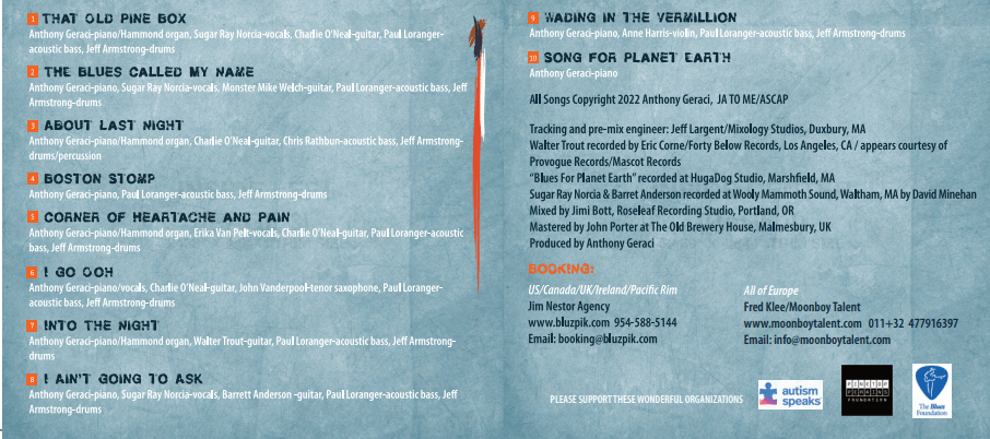 The other instrumentals are “Into the Night,” as Walter Trout leads with pleading guitar; “Wading in the Vermillion,” with Anne Harris on violin and finally, “Song for Planet Earth,” an old-fashioned piano solo that allows Geraci to demonstrate his considerable mastery.