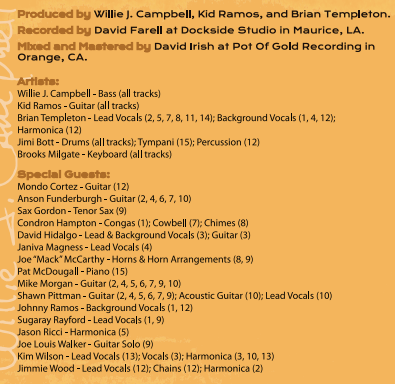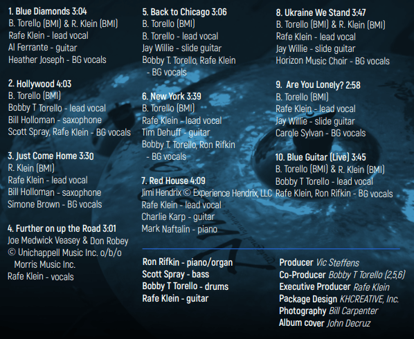 Torello brings his world-weary vocals to the front on “Back To Chicago,” highlighted by Willie’s sharp slide, and driven by an enthusiastic version of Bo Diddley’s trademark beat. “New York” features a soulful vocal turn by Klein, and then guitar legend Charlie Karp is honored with the inclusion of the blues chestnut “Red House,” a stirring track released posthumously in tribute to a departed friend.