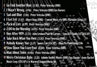 | Texas Horns – Silver Bells Benny Turner – I Want Some Christmas Cheer Lil Red & the Rooster – Santa Baby Teresa James – I Saw Mommy Kissing Santa Claus Rick Vito – Bad Boy This Year Jim Koeppel – Slim Down Santa Clarence Spady – Christmas Bobby Gentilo – Santa Claus Go Straight to the Ghetto Tomislav Goluban – Amazing Grace Mark Cameron – Nick’s Place Laura Tate – Merry Christmas Baby Vaneese Thomas – Peace and Good Will Peter Veteska – I’ll Be Home For Christmas Tiffany Pollack & Eric Johanson – River Teaxs Horns featuring Teresa James – Even Santa Gets the Blues |